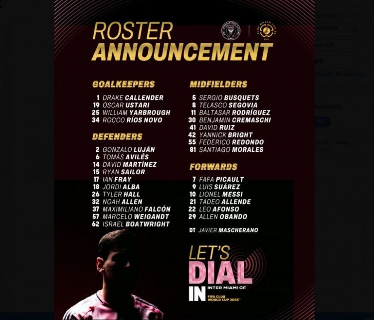 世俱杯开赛在即,迈阿密国际公布了参赛大名单,梅西领衔,苏亚雷斯、布斯克茨、阿尔巴悉数在列。